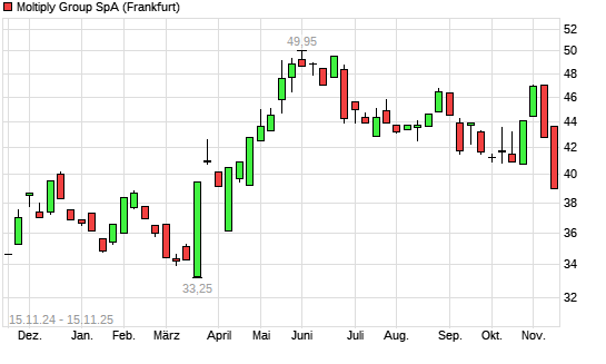 Mit dem Rücksetzer auf 39,00 EUR hat die Moltiply Group-Aktie (ISIN IT0004195308) am 14.11.2025 ein neues 6-Monats-Tief erreicht und damit den Kurs vom 20.10.2025 eingestellt.