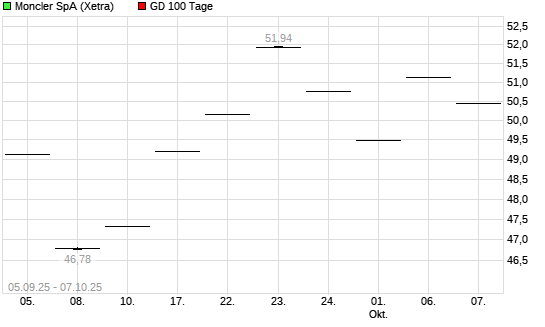 Mit dem Rücksetzer auf 49,25 EUR hat die Moncler-Aktie am 10.10.2025 die 100-Tage-Linie nach unten gekreuzt.