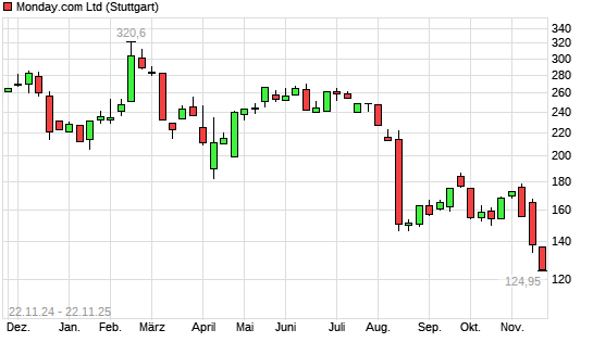 Mit dem Rücksetzer auf 124,60 EUR hat die Monday. Com-Aktie (ISIN IL0011762130) am 21.11.2025 ein neues 12-Monats-Tief erreicht und damit den Kurs vom 18.11.2025 eingestellt.