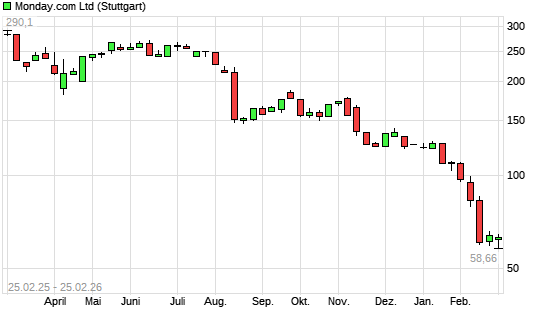 Mit dem Rücksetzer auf 59,54 EUR hat die Monday. Com-Aktie (ISIN IL0011762130) am 24.02.2026 ein neues All-Time-Low erreicht und damit den Kurs vom 17.02.2026 eingestellt.