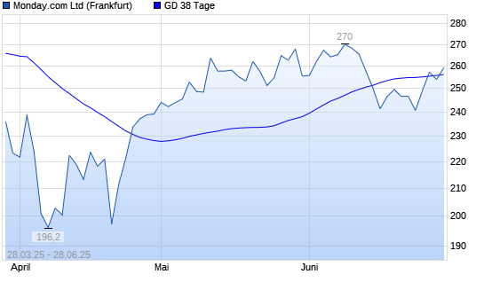 Mit dem Anstieg auf 259,10 EUR hat die Monday. Com-Aktie am 27.06.2025 die 38-Tage-Linie nach oben gekreuzt.