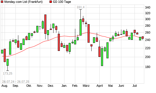 Mit dem Rücksetzer auf 243,60 EUR hat die Monday. Com-Aktie am 25.07.2025 die 100-Tage-Linie nach unten gekreuzt.