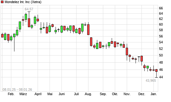 Mit dem Rücksetzer auf 44,01 EUR hat die Mondelez-Aktie (ISIN US6092071058) am 07.01.2026 ein neues 5-Jahres-Tief erreicht und damit den Kurs vom 03.03.2021 eingestellt.