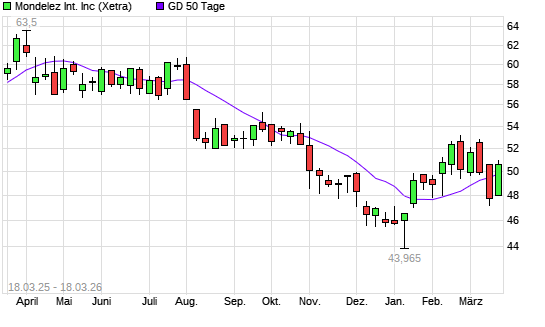 Mit dem Anstieg auf 50,12 EUR hat die Mondelez-Aktie am 17.03.2026 die 50-Tage-Linie nach oben gekreuzt.