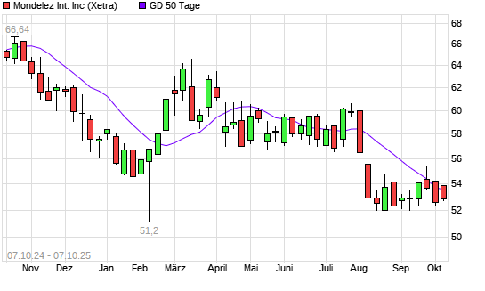 Mit dem Rücksetzer auf 52,73 EUR hat die Mondelez-Aktie am 06.10.2025 die 50-Tage-Linie nach unten gekreuzt.