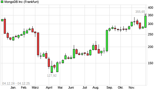 Mit dem Anstieg auf 347,85 EUR hat die MongoDB-Aktie (ISIN US60937P1066) am 03.12.2025 ein neues 12-Monats-Hoch erreicht und damit den Kurs vom 02.12.2025 eingestellt.