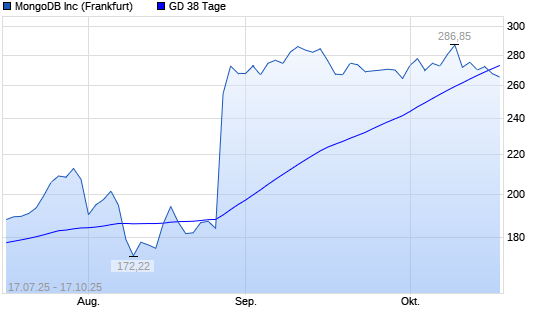 Mit dem Rücksetzer auf 267,70 EUR hat die MongoDB-Aktie am 16.10.2025 die 38-Tage-Linie nach unten gekreuzt.