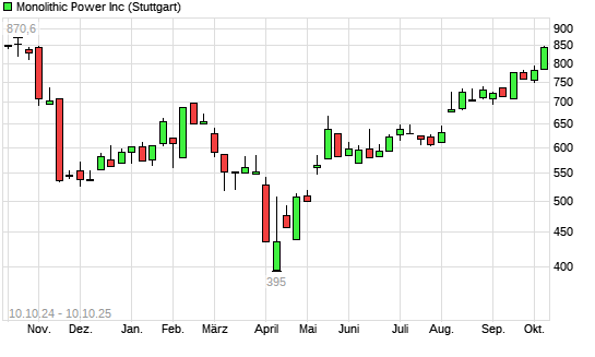Mit dem Anstieg auf 827,40 EUR hat die Monolithic Power Systems-Aktie (ISIN US6098391054) am 09.10.2025 ein neues 6-Monats-Hoch erreicht und damit den Kurs vom 07.10.2025 eingestellt.