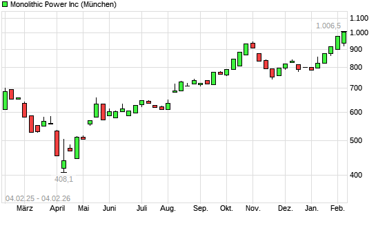 Mit dem Anstieg auf 990,20 EUR hat die Monolithic Power Systems-Aktie (ISIN US6098391054) am 03.02.2026 ein neues All-Time-High erreicht und damit den Kurs vom 30.01.2026 eingestellt.