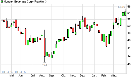Mit dem Anstieg auf 54,60 EUR hat die Monster Beverage-Aktie (ISIN US61174X1090) am 03.04.2025 ein neues 12-Monats-Hoch erreicht und damit den Kurs vom 02.04.2025 eingestellt.