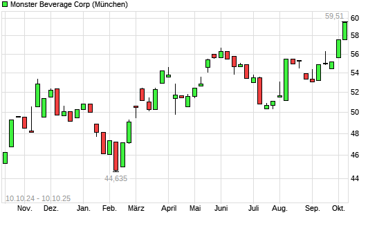 Mit dem Anstieg auf 59,63 EUR hat die Monster Beverage-Aktie (ISIN US61174X1090) am 09.10.2025 ein neues All-Time-High erreicht und damit den Kurs vom 08.10.2025 eingestellt.