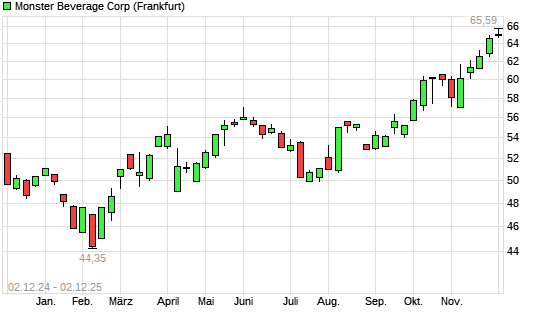 Mit dem Anstieg auf 65,59 EUR hat die Monster Beverage-Aktie (ISIN US61174X1090) am 01.12.2025 ein neues All-Time-High erreicht und damit den Kurs vom 26.11.2025 eingestellt.
