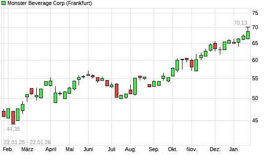Mit dem Anstieg auf 69,81 EUR hat die Monster Beverage-Aktie (ISIN US61174X1090) am 21.01.2026 ein neues All-Time-High erreicht und damit den Kurs vom 20.01.2026 eingestellt.