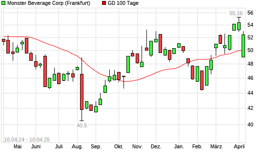 Mit dem Rücksetzer auf 49,18 EUR hat die Monster Beverage-Aktie am 09.04.2025 die 100-Tage-Linie nach unten gekreuzt.