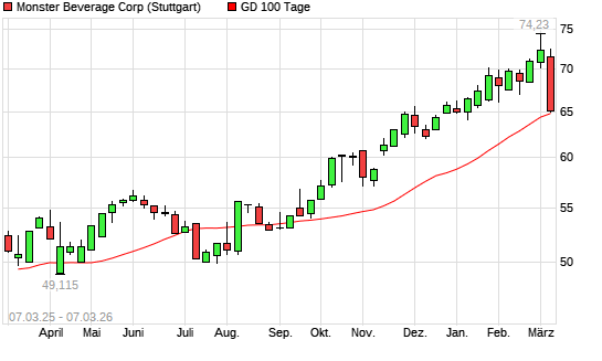 Mit dem Rücksetzer auf 64,96 EUR hat die Monster Beverage-Aktie am 06.03.2026 die 100-Tage-Linie nach unten gekreuzt.