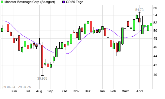 Mit dem Rücksetzer auf 51,22 EUR hat die Monster Beverage-Aktie am 28.04.2025 die 50-Tage-Linie nach unten gekreuzt.