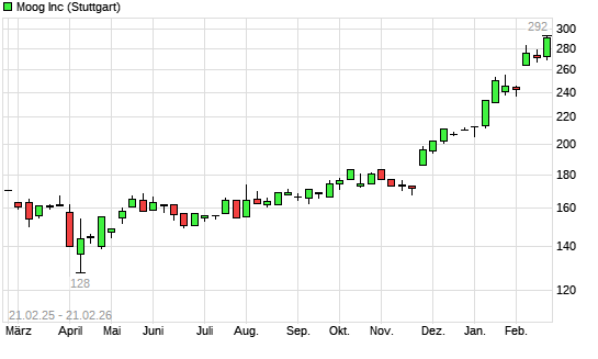 Mit dem Anstieg auf 294,00 EUR hat die Moog-Aktie (ISIN US6153942023) am 20.02.2026 ein neues All-Time-High erreicht und damit den Kurs vom 05.02.2026 eingestellt.