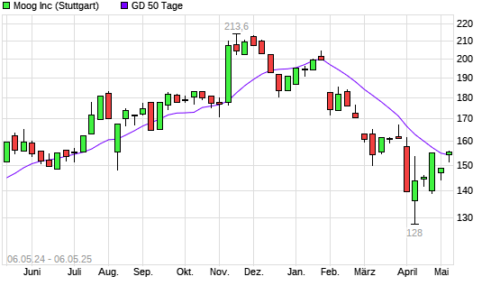 Mit dem Anstieg auf 154,50 EUR hat die Moog-Aktie am 05.05.2025 die 50-Tage-Linie nach oben gekreuzt.
