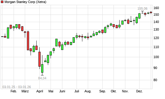 Mit dem Anstieg auf 154,76 EUR hat die Morgan Stanley-Aktie (ISIN US6174464486) am 02.01.2026 ein neues All-Time-High erreicht und damit den Kurs vom 09.12.2025 eingestellt.