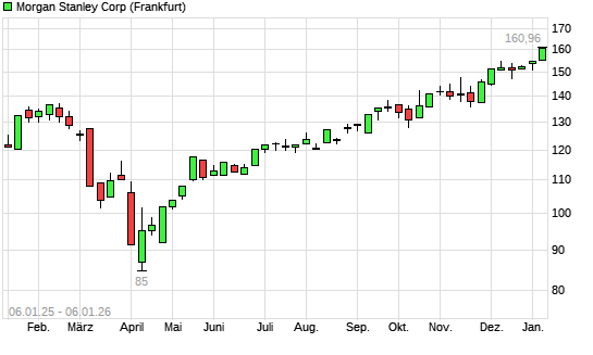 Mit dem Anstieg auf 158,78 EUR hat die Morgan Stanley-Aktie (ISIN US6174464486) am 05.01.2026 ein neues All-Time-High erreicht und damit den Kurs vom 02.01.2026 eingestellt.