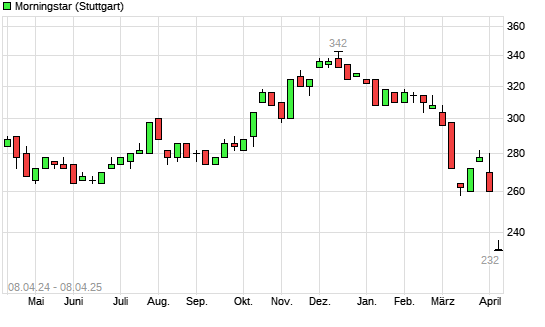 Mit dem Rücksetzer auf 236,00 EUR hat die Morningstar-Aktie (ISIN US6177001095) am 07.04.2025 ein neues 12-Monats-Tief erreicht und damit den Kurs vom 11.03.2025 eingestellt.