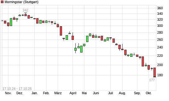 Mit dem Rücksetzer auf 186,00 EUR hat die Morningstar-Aktie (ISIN US6177001095) am 16.10.2025 ein neues 12-Monats-Tief erreicht und damit den Kurs vom 03.10.2025 eingestellt.