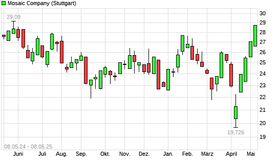 Mit dem Anstieg auf 28,18 EUR hat die Mosaic-Aktie (ISIN US61945C1036) am 07.05.2025 ein neues 6-Monats-Hoch erreicht und damit den Kurs vom 30.01.2025 eingestellt.
