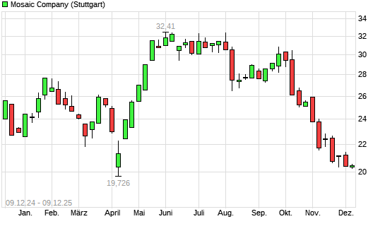 Mit dem Rücksetzer auf 20,07 EUR hat die Mosaic-Aktie (ISIN US61945C1036) am 08.12.2025 ein neues 6-Monats-Tief erreicht und damit den Kurs vom 04.12.2025 eingestellt.