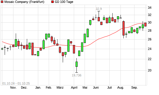 Mit dem Rücksetzer auf 29,27 EUR hat die Mosaic-Aktie am 30.09.2025 die 100-Tage-Linie nach unten gekreuzt.
