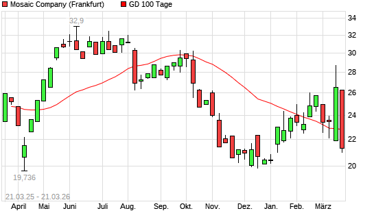Mit dem Rücksetzer auf 21,32 EUR hat die Mosaic-Aktie am 20.03.2026 die 100-Tage-Linie nach unten gekreuzt.