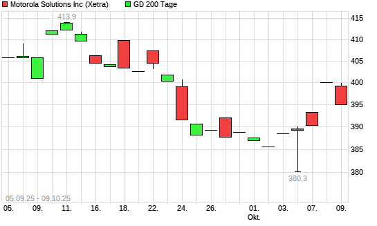 Mit dem Anstieg auf 396,70 EUR hat die Motorola Solutions-Aktie am 08.10.2025 die 200-Tage-Linie nach oben gekreuzt.