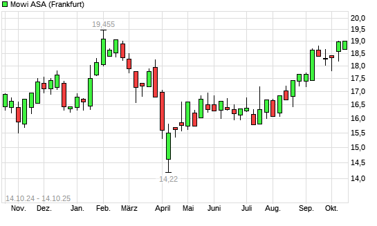 Mit dem Anstieg auf 19,00 EUR hat die Mowi ASA-Aktie (ISIN NO0003054108) am 13.10.2025 ein neues 6-Monats-Hoch erreicht und damit den Kurs vom 10.10.2025 eingestellt.