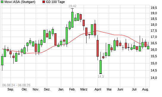 Mit dem Rücksetzer auf 16,08 EUR hat die Mowi ASA-Aktie am 05.08.2025 die 100-Tage-Linie nach unten gekreuzt.
