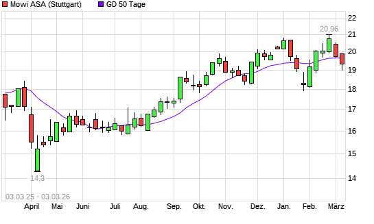 Mit dem Rücksetzer auf 19,68 EUR hat die Mowi ASA-Aktie am 02.03.2026 die 50-Tage-Linie nach unten gekreuzt.