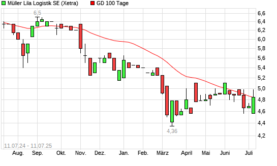 Mit dem Anstieg auf 4,74 EUR hat die Müller - Die lila Logistik-Aktie am 10.07.2025 die 100-Tage-Linie nach oben gekreuzt.