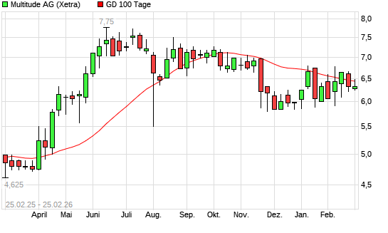 Mit dem Anstieg auf 6,40 EUR hat die Multitude-Aktie am 24.02.2026 die 100-Tage-Linie nach oben gekreuzt.