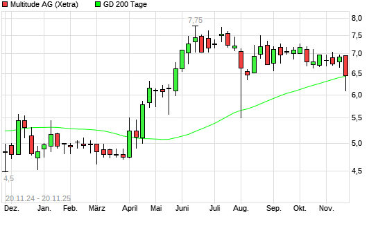 Mit dem Rücksetzer auf 6,11 EUR hat die Multitude-Aktie am 19.11.2025 die 200-Tage-Linie nach unten gekreuzt.