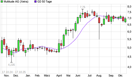 Mit dem Rücksetzer auf 6,87 EUR hat die Multitude-Aktie am 16.10.2025 die 50-Tage-Linie nach unten gekreuzt.