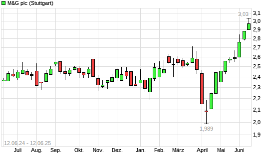 Mit dem Anstieg auf 2,98 EUR hat die M&G-Aktie (ISIN GB00BKFB1C65) am 11.06.2025 ein neues 5-Jahres-Hoch erreicht und damit den Kurs vom 09.06.2025 eingestellt.