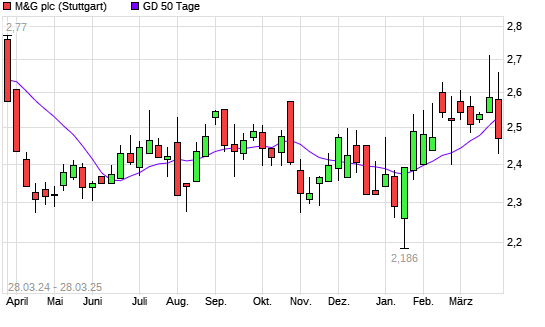 Mit dem Rücksetzer auf 2,46 EUR hat die M&G-Aktie am 27.03.2025 die 50-Tage-Linie nach unten gekreuzt.
