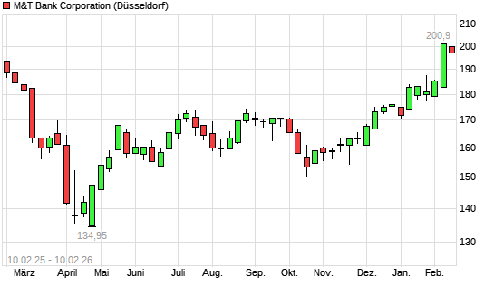 Mit dem Anstieg auf 199,80 EUR hat die M&T Bank-Aktie (ISIN US55261F1049) am 09.02.2026 ein neues 12-Monats-Hoch erreicht und damit den Kurs vom 06.02.2026 eingestellt.