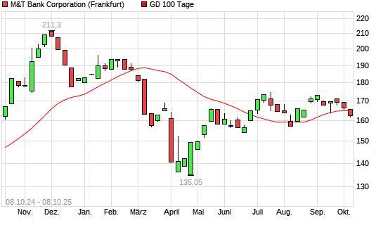 Mit dem Rücksetzer auf 161,75 EUR hat die M&T Bank-Aktie am 07.10.2025 die 100-Tage-Linie nach unten gekreuzt.Die M&T Bank-Aktie befindet sich seit dem 01.10.2025 im ...weiterlesen