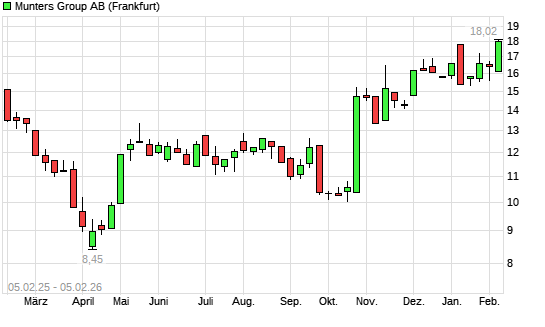 Mit dem Anstieg auf 18,02 EUR hat die Munters Group B-Aktie (ISIN SE0009806607) am 04.02.2026 ein neues 12-Monats-Hoch erreicht und damit den Kurs vom 22.01.2026 eingestellt.