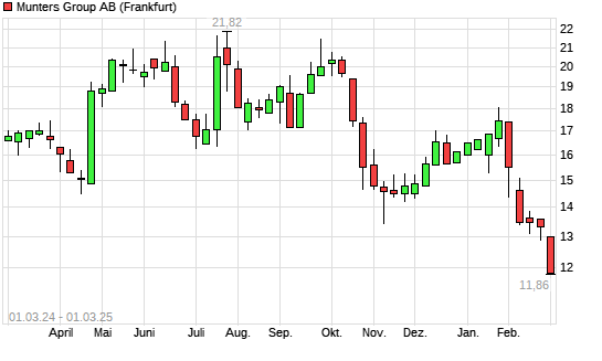 Mit dem Rücksetzer auf 11,86 EUR hat die Munters Group B-Aktie (ISIN SE0009806607) am 28.02.2025 ein neues 12-Monats-Tief erreicht und damit den Kurs vom 25.02.2025 eingestellt.