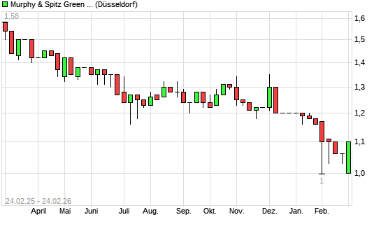 Mit dem Rücksetzer auf 1,00 EUR hat die Murphy & Spitz Green Capital-Aktie (ISIN DE000A0KPM66) am 23.02.2026 ein neues 5-Jahres-Tief erreicht und damit den Kurs vom 17.02.2026 eingestellt.