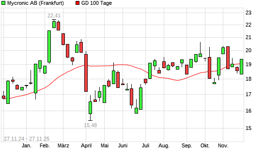 Mit dem Anstieg auf 19,61 EUR hat die Mycronic AB-Aktie am 26.11.2025 die 100-Tage-Linie nach oben gekreuzt.