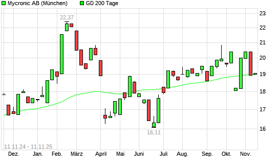 Mit dem Anstieg auf 19,11 EUR hat die Mycronic AB-Aktie am 10.11.2025 die 200-Tage-Linie nach oben gekreuzt.