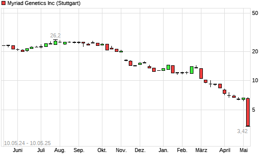 Mit dem Rücksetzer auf 3,54 EUR hat die Myriad Genetics-Aktie (ISIN US62855J1043) am 09.05.2025 ein neues 10-Jahres-Tief erreicht und damit den Kurs vom 08.05.2025 eingestellt.