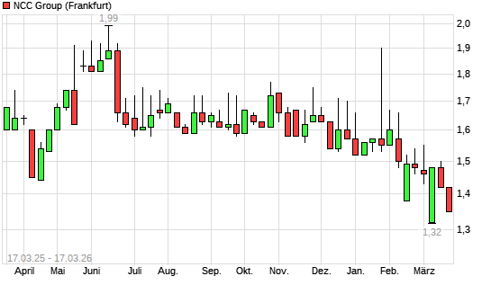Mit dem Rücksetzer auf 1,35 EUR hat die NCC GROUP-Aktie (ISIN GB00B01QGK86) am 16.03.2026 ein neues 12-Monats-Tief erreicht und damit den Kurs vom 03.03.2026 eingestellt.