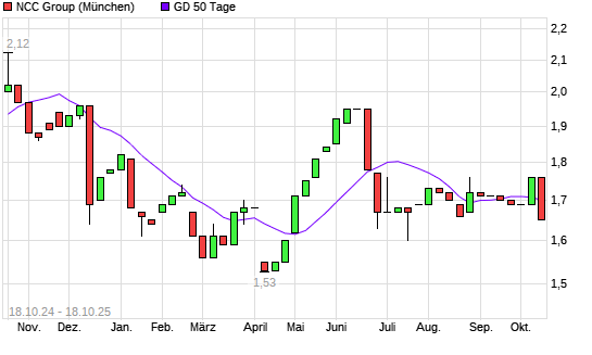 Mit dem Rücksetzer auf 1,61 EUR hat die NCC GROUP-Aktie am 17.10.2025 die 50-Tage-Linie nach unten gekreuzt.